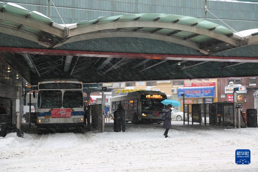1月29日,在美國紐約,行人走過公交站。