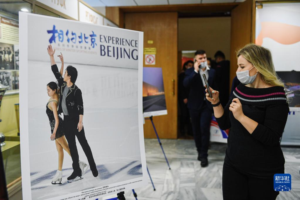 2022年1月21日,一名女子在俄羅斯莫斯科觀看“北京冬奧會,一起向未來”冬奧圖片展。新華社發(葉甫蓋尼·西尼岑攝)