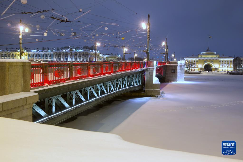 2022年1月31日傍晚,俄羅斯圣彼得堡地標性建筑冬宮橋亮起“中國紅”,迎接中國農歷虎年春節的到來。新華社發(莫京娜 攝)