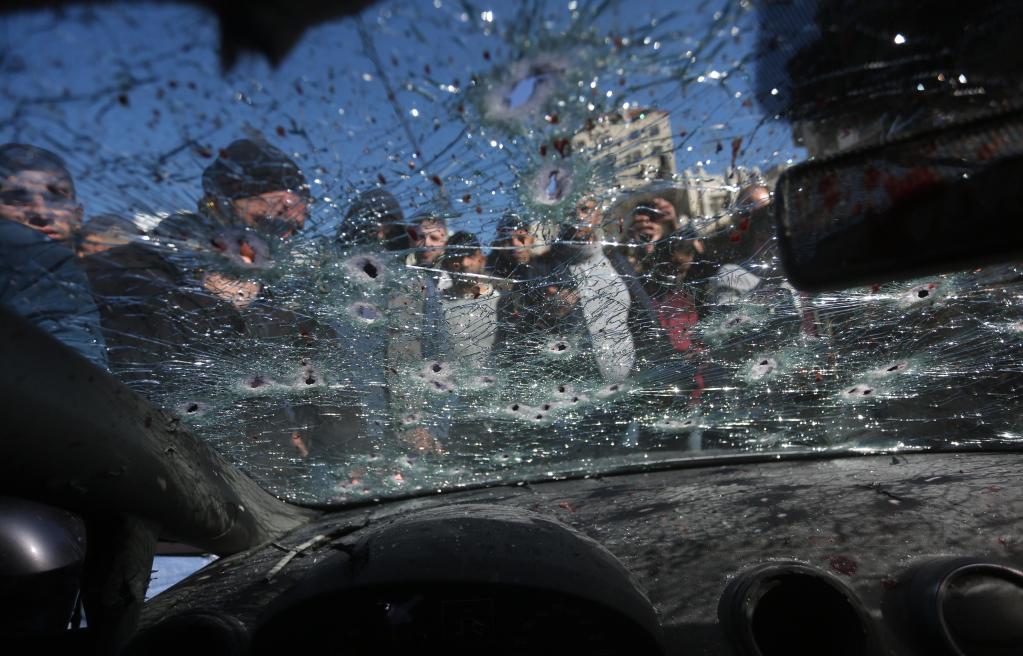 2月8日,在約旦河西岸城市納布盧斯,人們聚集在被以軍打死的3名巴勒斯坦人的車旁。(新華社發,艾曼·諾巴尼攝)