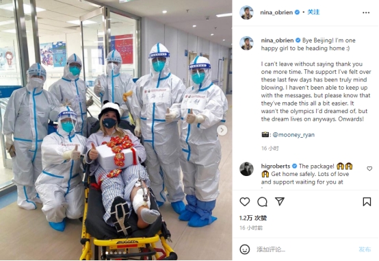 美國選手尼娜·奧布萊恩在海外社交媒體發文感謝中國醫護。(圖片來源:Instagram)