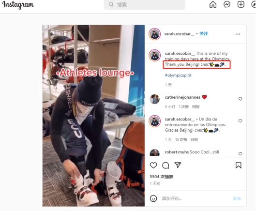 她對自己的訓練非常滿意,特意在海外社交媒體用英語和西班牙語雙語發文稱:“這是我在冬奧村里日常訓練的一天。謝謝你,北京!”