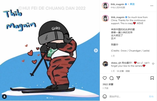 西班牙滑雪運動員蒂博·馬格寧用雙語感謝中國。(圖片來源:Instagram)