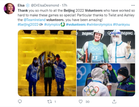 格魯吉亞高山滑雪運動員妮諾·齊克勞里說“中國志愿者非常熱情,把自己的快樂傳遞給所有運動員”;日本《Daily》記者稱志愿者“全都是親切的工作人員,厚重防護服下是一雙雙含笑的眼睛”。愛爾蘭雪橇運動員埃爾莎·德斯蒙德在自己的社交媒體賬號發文感謝志愿者們的熱情幫助。