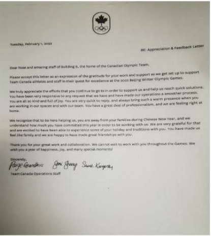 此外,加拿大奧運團隊還寫了一封感謝信給中國冬奧工作團隊,表達他們的感激之情。信中寫道:“我們了解,你們在中國新年期間遠離家人,來到這里幫助我們。我們也了解,為了我們,你們在今年的工作中付出了多大的努力。我們對此非常感激,也很高興能和你們一起體驗你們的節日和傳統。你們讓我們感覺像家人一樣,我們很高興和你們建立了深厚的友誼?!?/p>