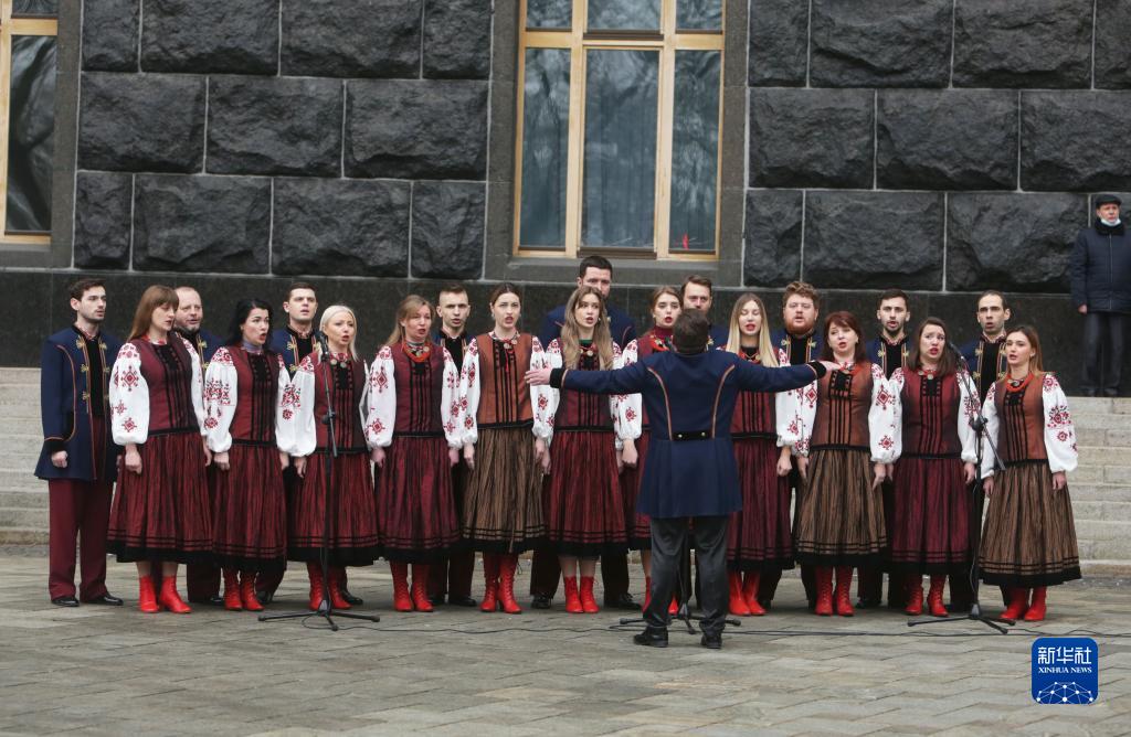2月16日,在烏克蘭首都基輔,身著烏克蘭傳統服飾的合唱團演員唱國歌。