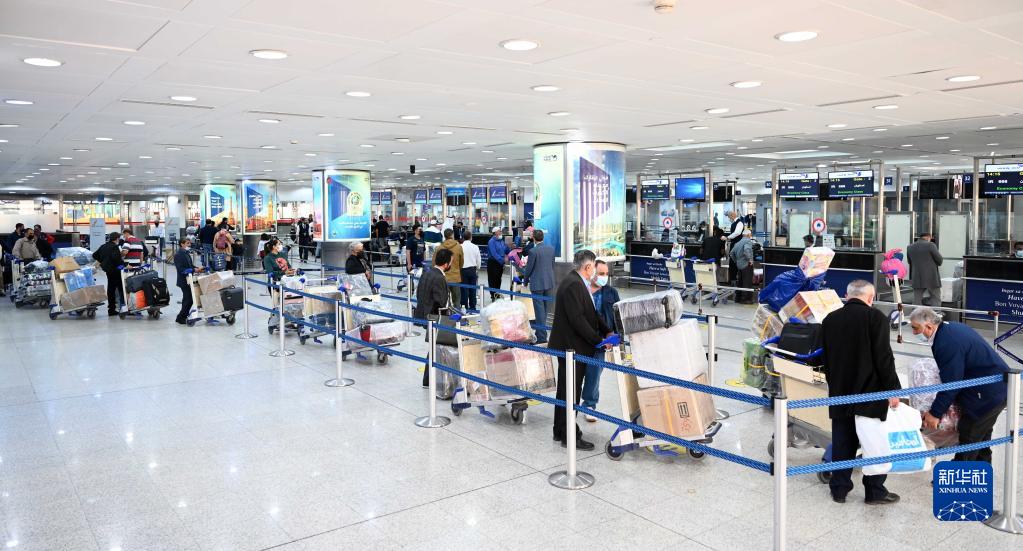 2月20日,在科威特費爾瓦尼耶省的科威特國際機場出發大廳,旅客排隊辦理登機手續。