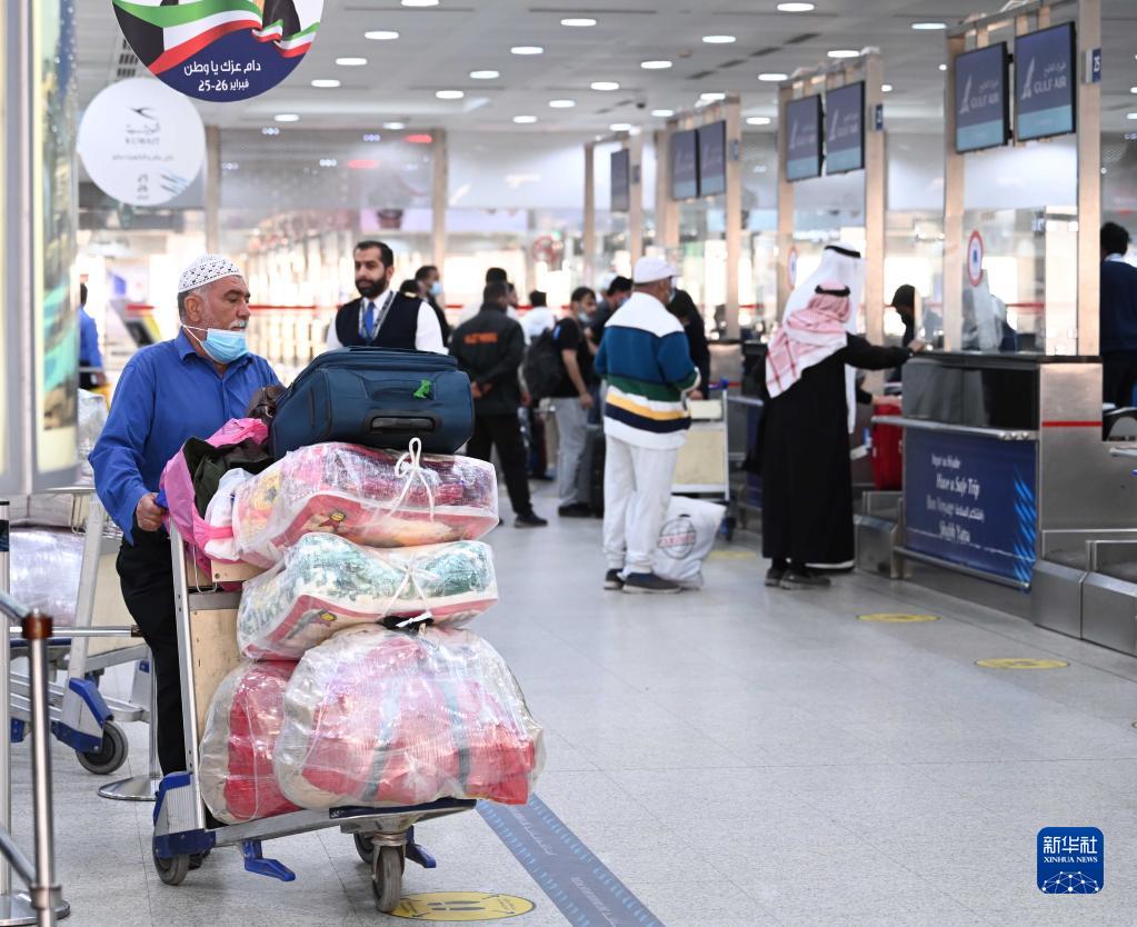 2月20日,在科威特費爾瓦尼耶省的科威特國際機場出發大廳,旅客辦理登機手續。