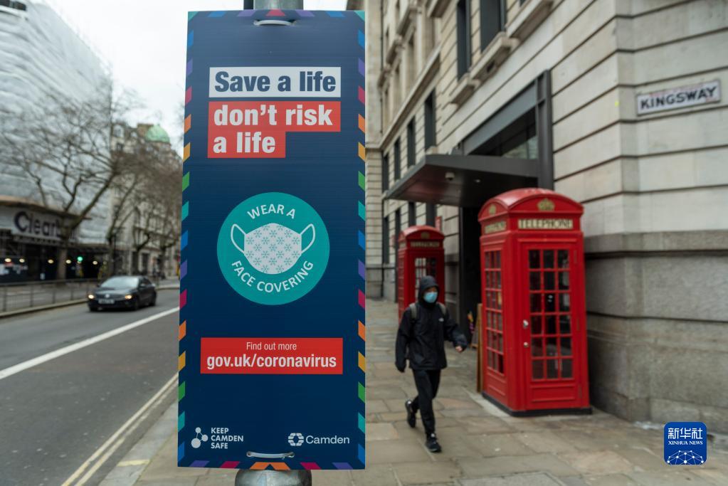 2月21日,在英國倫敦,一名男子經過街頭鼓勵人們戴口罩的告示。