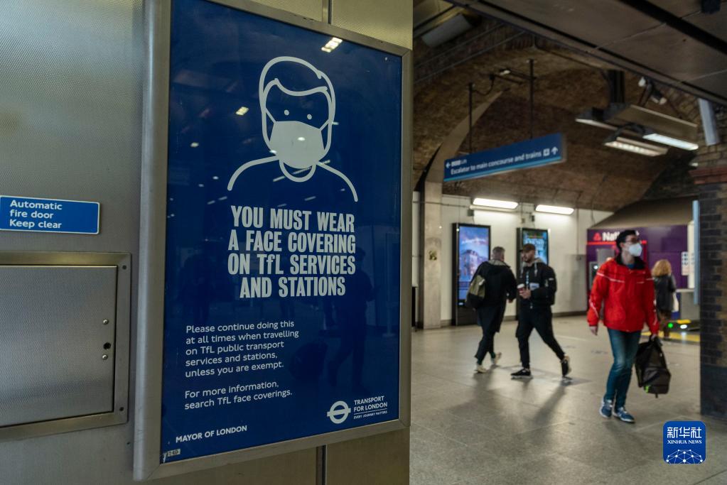 2月21日,在英國倫敦,人們經過地鐵內要求佩戴口罩的告示。