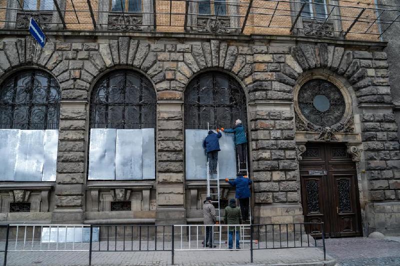3月2日,工人在烏克蘭利沃夫為一處歷史建筑做保護措施。新華社記者任珂攝