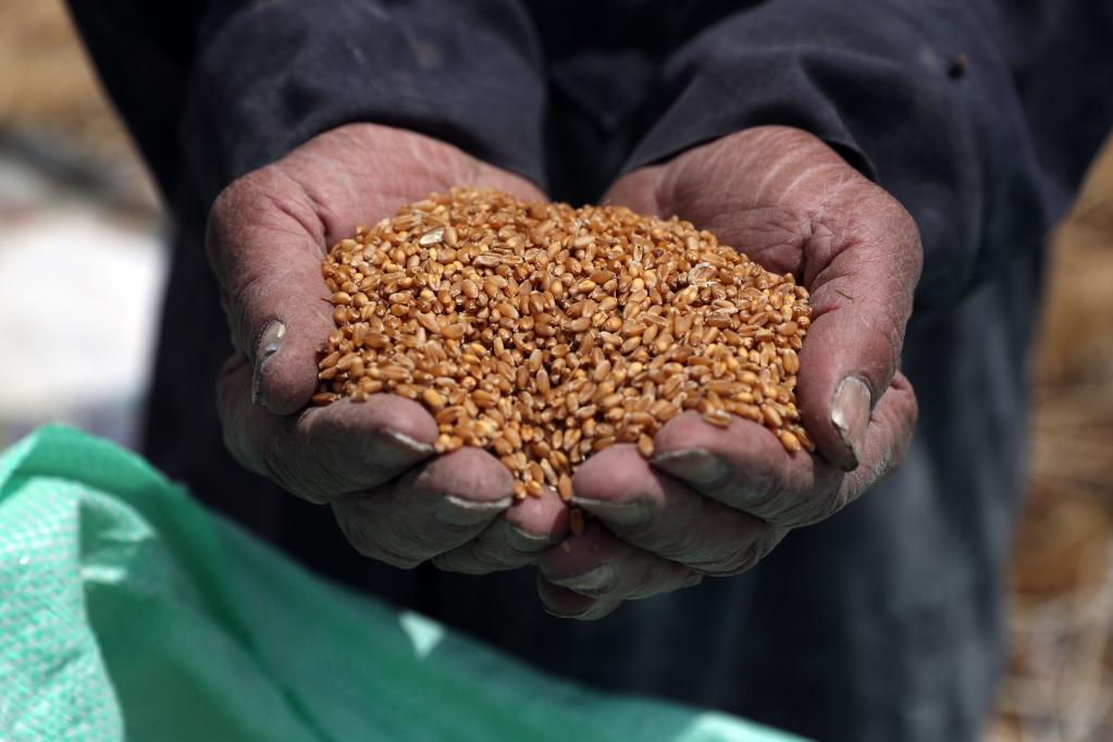 2019年5月9日,在埃及蓋盧比尤,農民展示剛收獲的小麥。新華社發(艾哈邁德·戈馬攝)