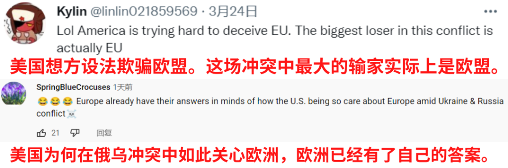 俄羅斯是世界石油、天然氣、糧食、金屬礦產的重要供應國。歐盟進口天然氣中約40%、進口原油中約30%來自俄羅斯。對歐洲來說,制裁俄羅斯的同時也推高了能源價格、糧食價格,危及歐洲自身糧食安全,增加了歐洲金融市場不穩定性,導致歐洲經濟信心下滑。這一切,真是“多虧”了歐洲的好盟友——美國。
