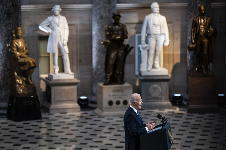 1月6日,美國總統拜登在華盛頓國會大廈發表講話,紀念國會山騷亂事件一周年。新華社發
