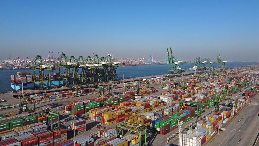 這是2021年12月18日拍攝的天津港太平洋國際集裝箱碼頭(無人機照片)。新華社記者趙子碩 攝