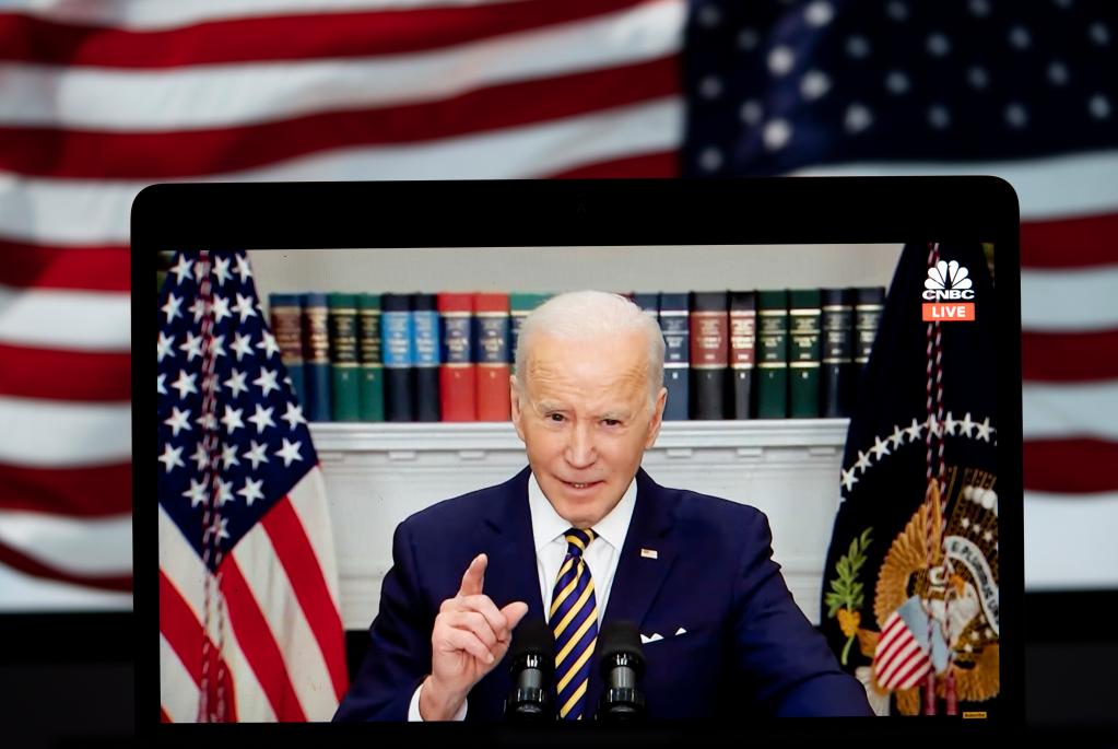 3月8日拍攝的視頻畫面顯示,美國總統拜登在華盛頓白宮發表講話。新華社記者劉杰攝