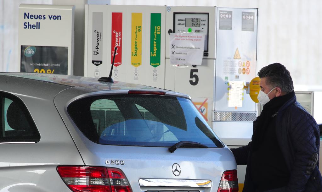 3月18日,一名男子在德國法蘭克福一處加油站為汽車加油。近日,德國油價大幅上漲。新華社發(阿曼多·巴巴尼攝)