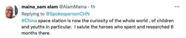 “中國空間站激發全球特別是孩童和青少年的好奇心。向在太空生活和工作了半年的英雄們致敬!”
