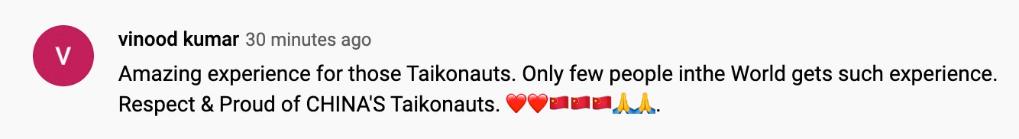 “這些航天員的經歷太了不起了!全球有過如此經歷的人寥寥無幾。向中國航天員致敬,為他們感到驕傲!”