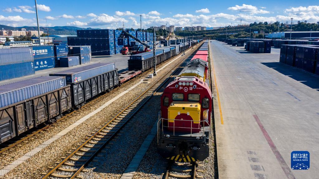 2022年1月1日,滿載30個標準集裝箱的中老鐵路新年首趟國際貨物列車??吭谥需F聯集昆明中心站(無人機照片)。新華社記者 胡超 攝