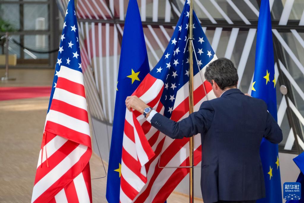 2022年3月24日,工作人員在比利時布魯塞爾的歐盟總部整理美國國旗。北約、七國集團和歐盟三場峰會24日在比利時布魯塞爾召開。新華社記者 張鋮 攝