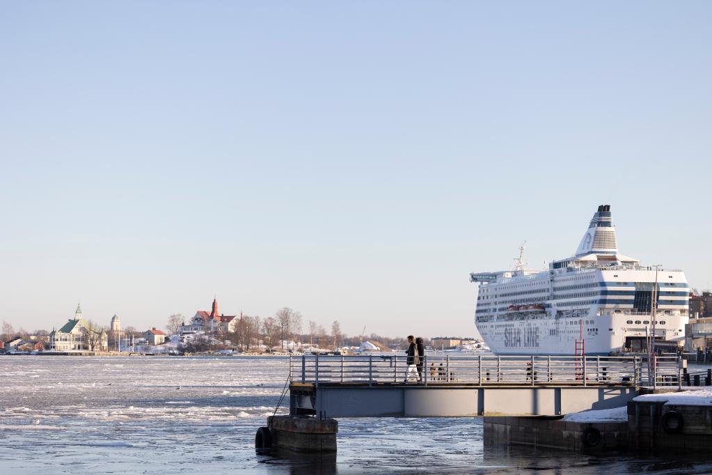 這是3月16日拍攝的芬蘭赫爾辛基集市廣場前的海景。新華社發(馬蒂·馬蒂凱寧攝)