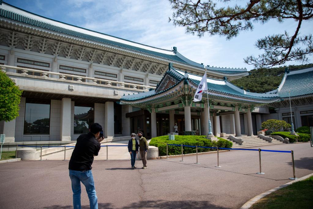 5月12日,在韓國首爾,游客參觀青瓦臺本館時合影留念。(新華社記者王益亮攝)