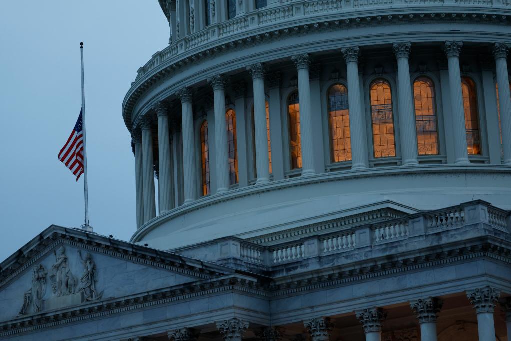5月24日,在美國首都華盛頓,國會大廈降半旗向得克薩斯州槍擊事件遇害者致哀。得克薩斯州尤瓦爾迪市羅布小學當日發生槍擊事件,造成至少19名兒童和2名教師喪生。(新華社發,沈霆攝)