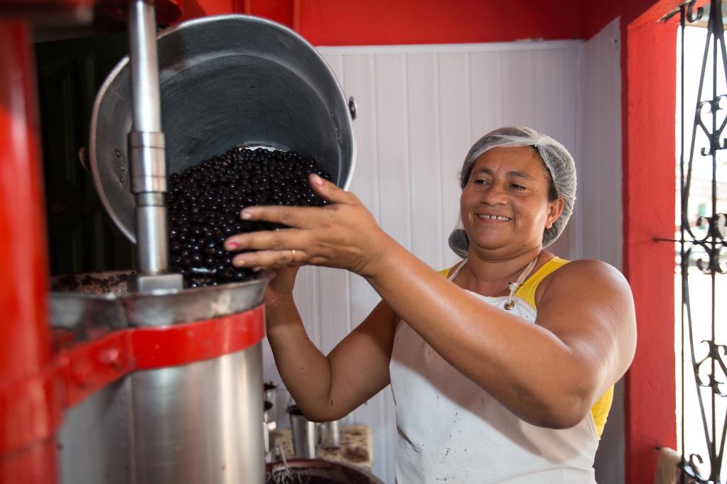 2017年7月15日,在巴西北部帕拉州維基亞市的“阿薩伊之家”小店,工作人員格洛麗亞將阿薩伊果倒入機器內打磨成果漿。新華社發(李明攝)