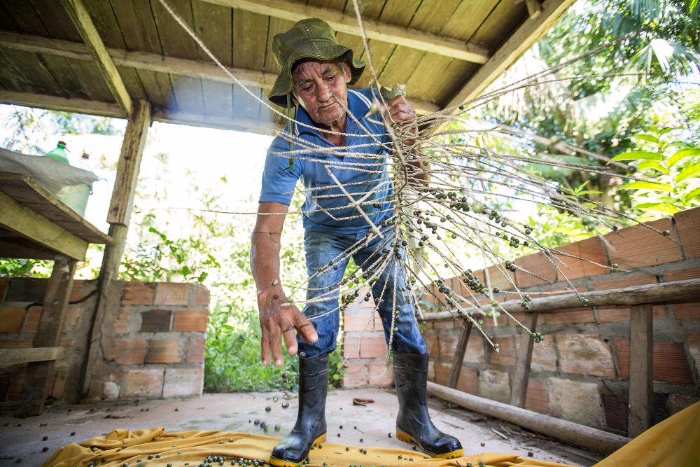 2017年7月15日,在巴西北部帕拉州維基亞市附近的圣若昂莊園,莊園主若昂·達席爾瓦將采摘的阿薩伊果從枝條上剝下。新華社發(李明攝)