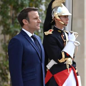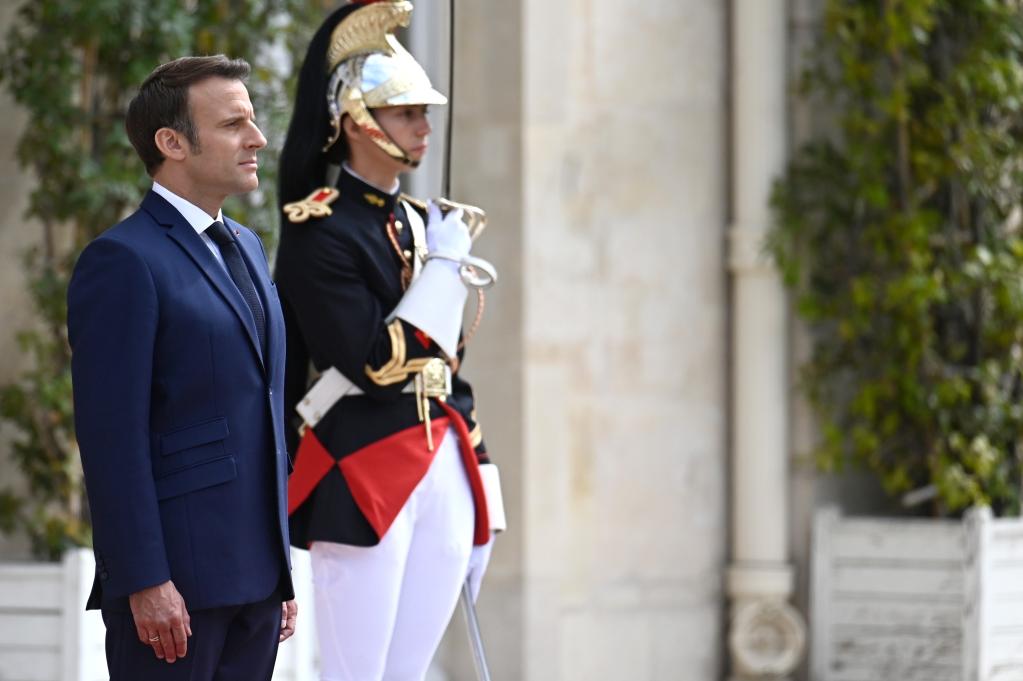 5月7日,在法國巴黎愛麗舍宮,法國總統馬克龍檢閱儀仗隊。(新華社發)