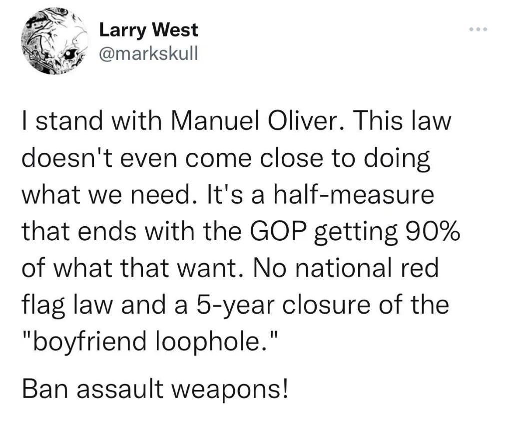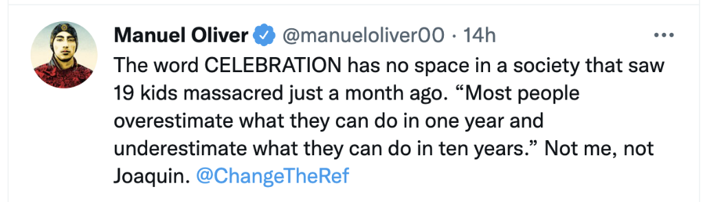 奧利弗的社交媒體賬號至今仍以兒子的肖像作為頭像。就在應邀出席白宮這場“慶功會”前,他在社交媒體上發文說:“美國一個多月前才發生了一場造成19個孩子遇害的槍擊慘案,現在可不應該使用‘慶?!@個詞?!?/strong>