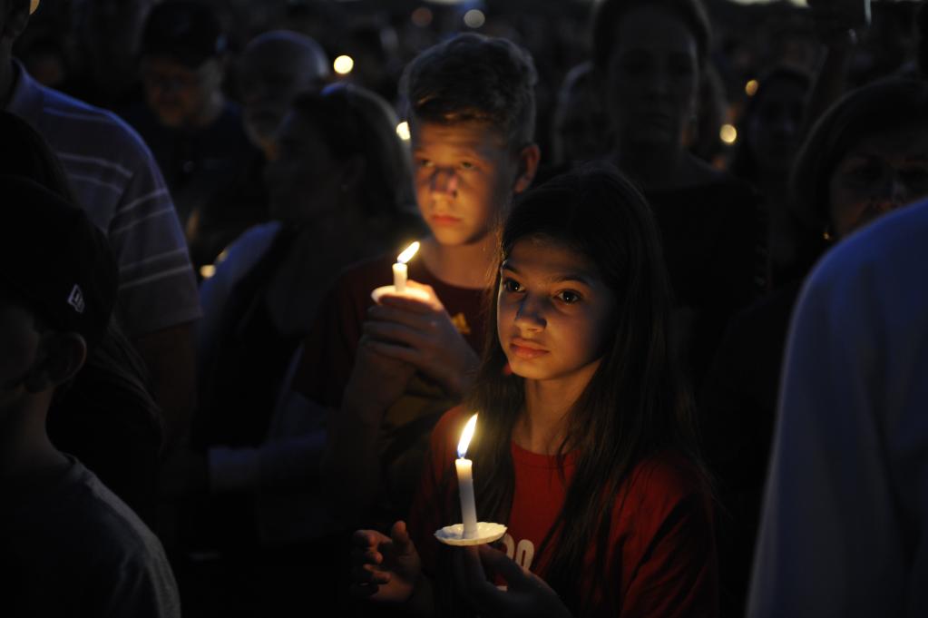 2018年2月15日,在美國佛羅里達州帕克蘭市,人們手舉蠟燭參加為悼念校園槍擊案遇難者舉行的守夜活動。新華社記者劉陽攝