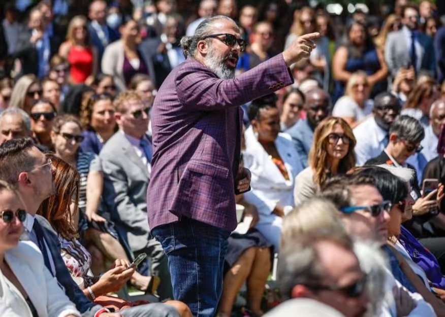 11日“慶功會”現場,拜登正在講話時,觀眾席上突然站起一名中年男子,高聲喊話?!白?,聽我把話說完?!卑莸钦f。不過,抗議者沒有停下來的意思。拜登停頓了幾秒,抿了抿嘴唇??棺h者喊道:“必須做得更多!這話我都已對你們說了很多年!”觀眾席上,很多人為他鼓掌。工作人員隨即上前要求他離開現場。他一個轉身,頭也不回地向外走去。