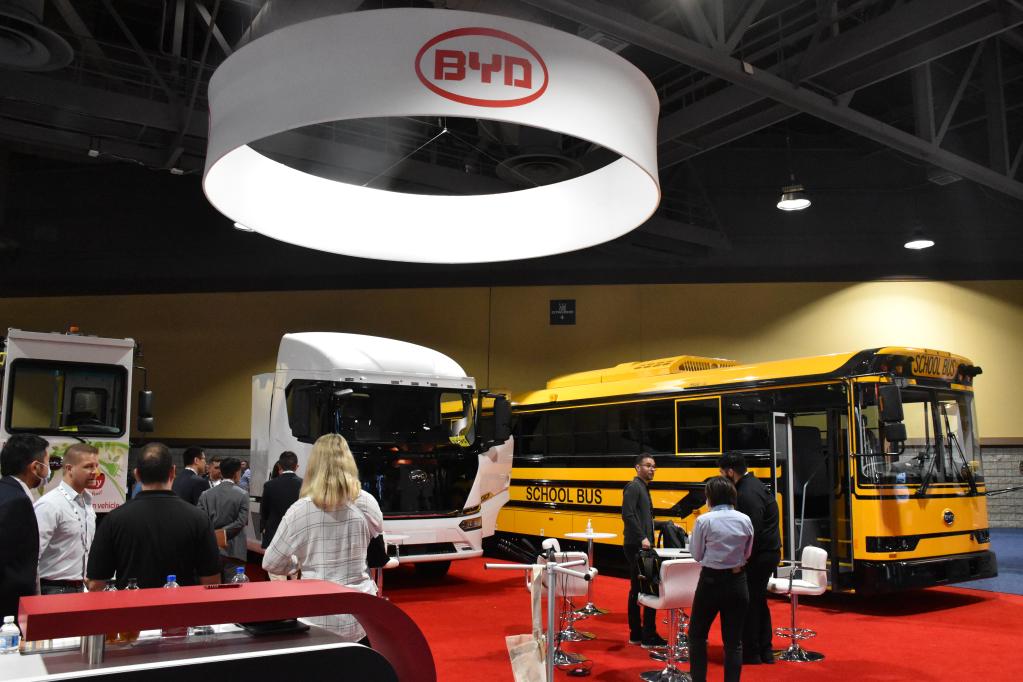 5月10日,人們在美國加利福尼亞州長灘市舉行的2022年先進清潔運輸博覽會上參觀比亞迪展區。(新華社發,曾慧攝)