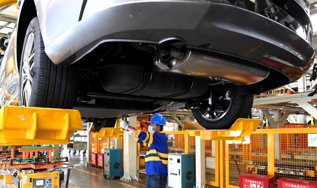 4月20日,工作人員在西安比亞迪草堂工業園汽車總裝廠進行新能源汽車裝配。(新華社記者劉瀟攝)