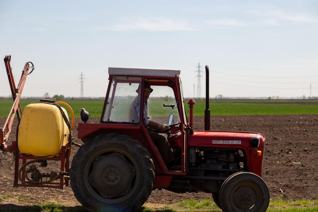 4月15日,一名男子駕駛農用機械車輛行駛在塞爾維亞舊帕佐瓦市附近一處農田間。新華社記者石中玉攝