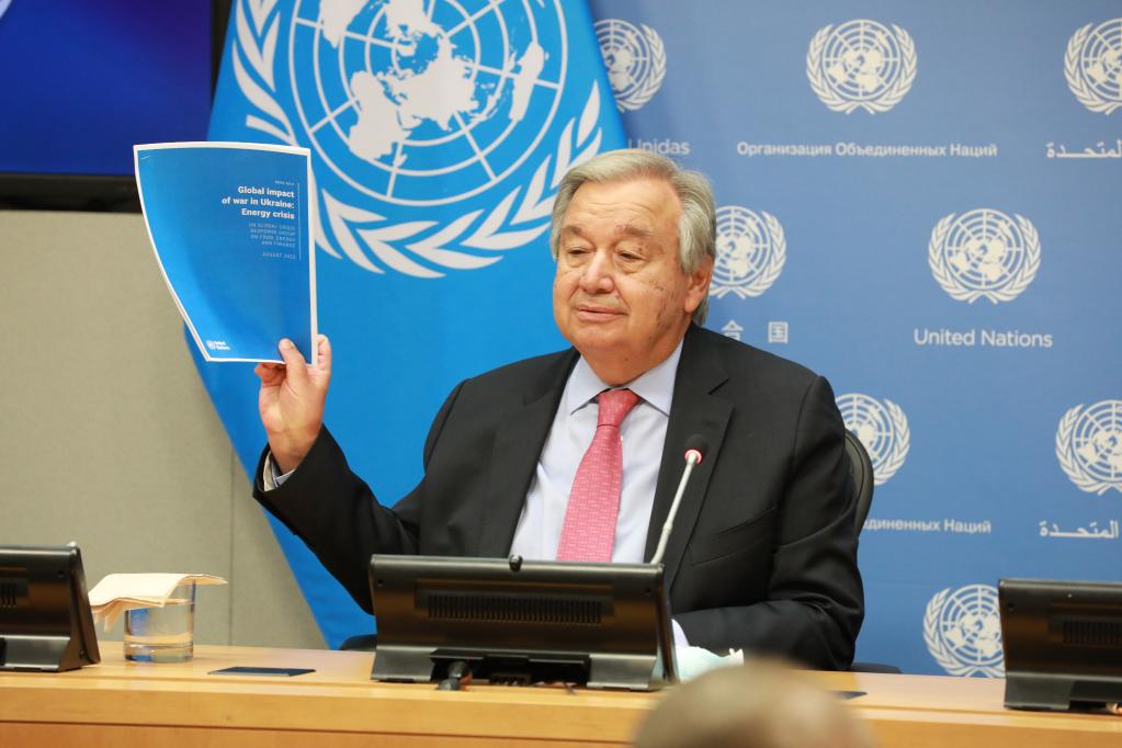8月3日,在位于紐約的聯合國總部,聯合國秘書長古特雷斯出席聯合國全球糧食、能源和金融危機應對小組第三次報告發布會。新華社記者謝鍔攝