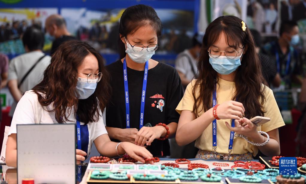 9月19日,年輕人在東博會緬甸館購買首飾。