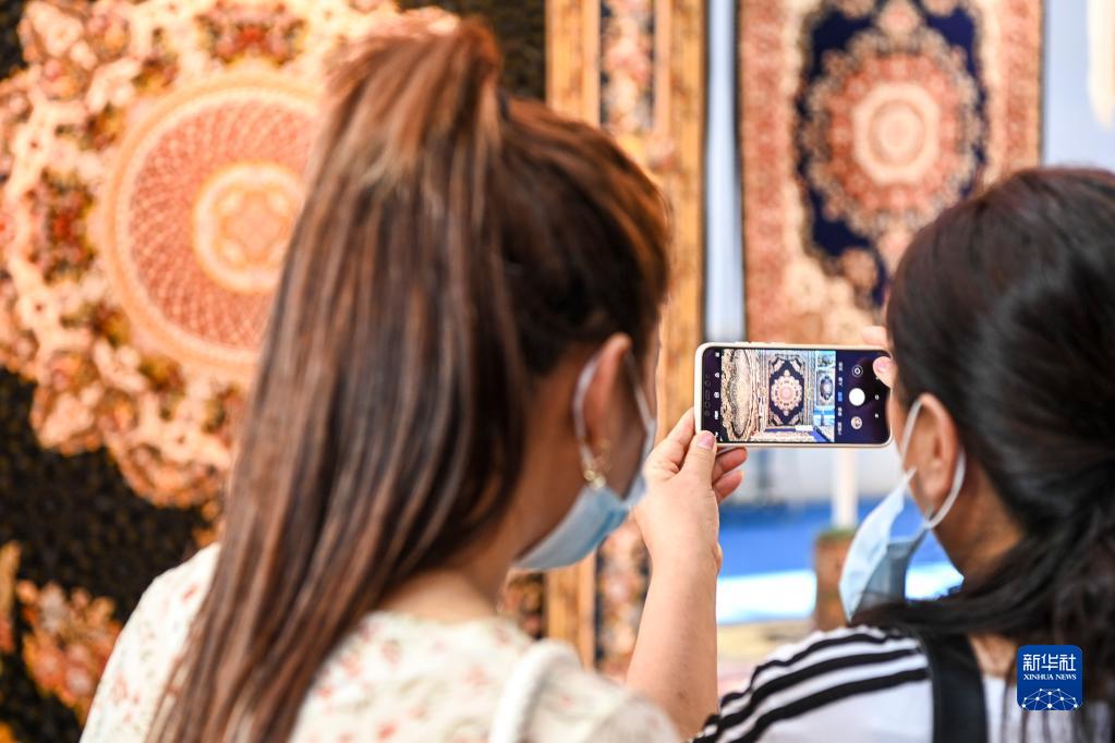 9月19日,在東博會展覽現場,參觀者用手機拍攝地毯產品。
