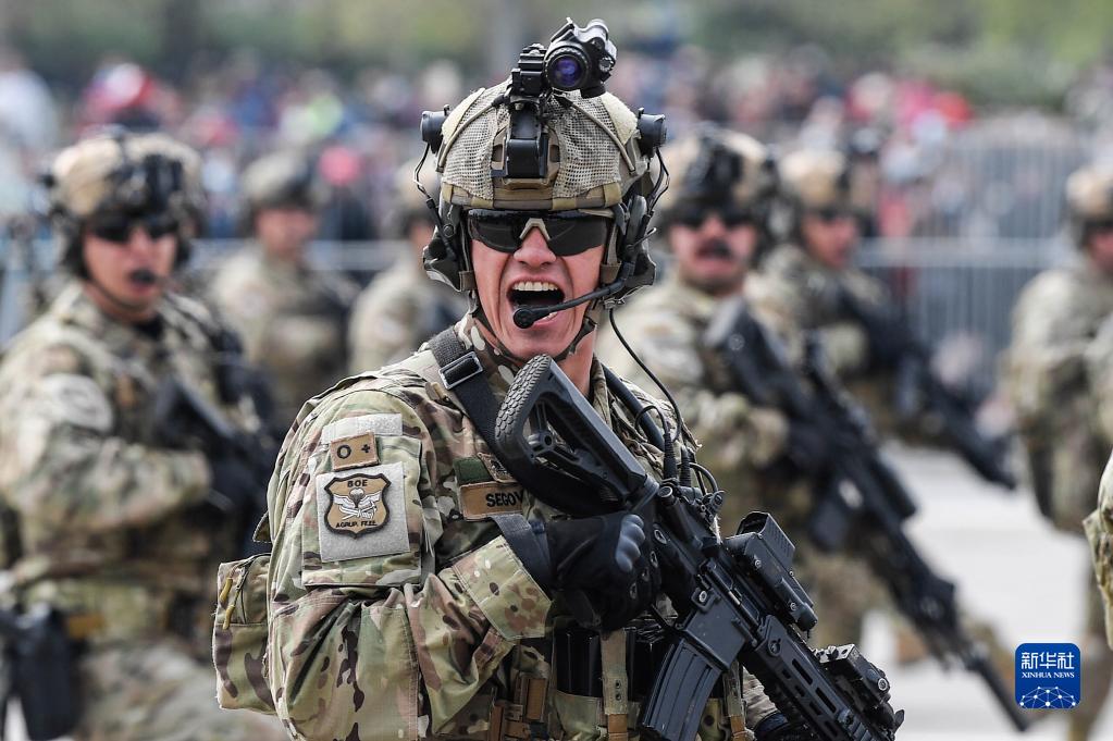 9月19日,在智利首都圣地亞哥,特種部隊士兵在閱兵式上行進。