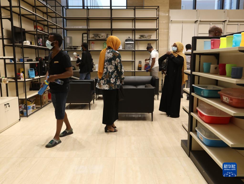 9月14日,在吉布提國際自貿區,非洲創業青年觀看跨境電商平臺商品。