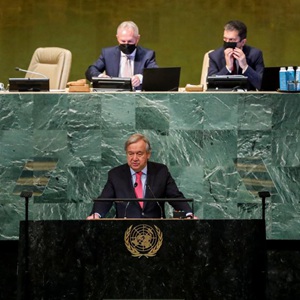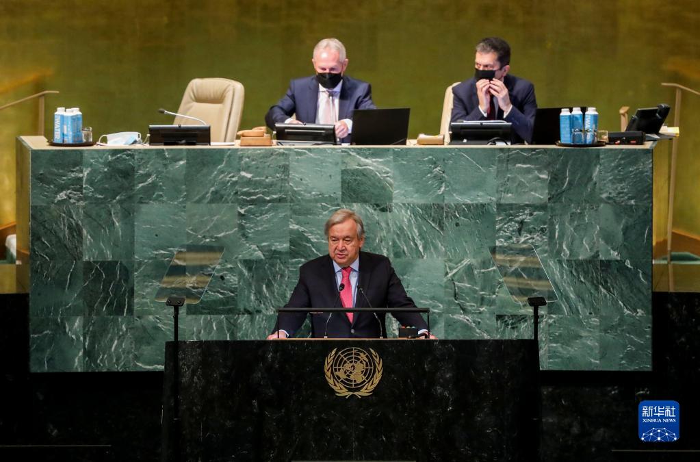 9月20日,在位于紐約的聯合國總部,聯合國秘書長古特雷斯(下)在聯合國大會一般性辯論開幕式上講話。