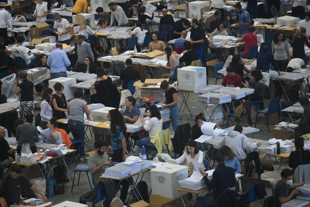 9月25日,在意大利博洛尼亞,工作人員對居住在國外的意大利公民的選票進行統計。新華社發(賈尼·斯基基攝)