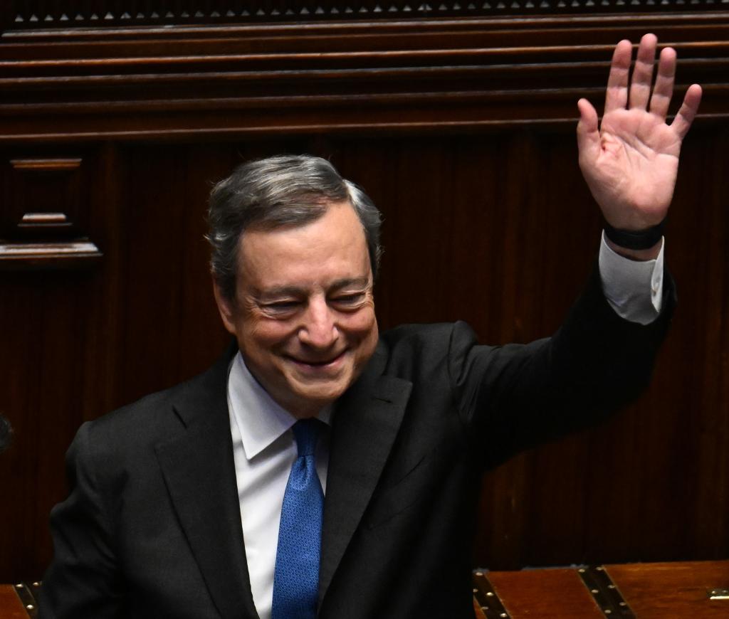 7月21日,在意大利羅馬,意大利總理馬里奧·德拉吉在眾議院發表講話后揮手致意。新華社發(阿爾貝托 攝)