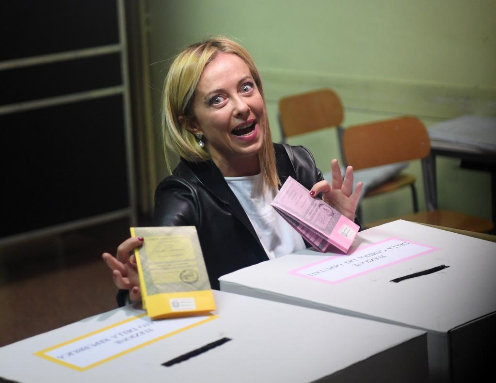9月25日,意大利兄弟黨黨首喬治婭·梅洛尼在羅馬一處投票站展示選票。新華社記者 金馬夢妮 攝