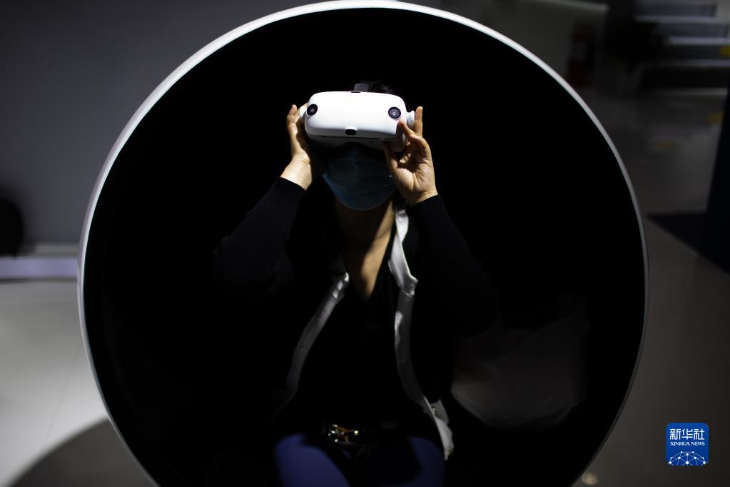 在第四屆進博會技術裝備展區,參觀者在體驗超臨場感3D虛擬視頻(2021年11月7日攝)。新華社記者 金立旺 攝