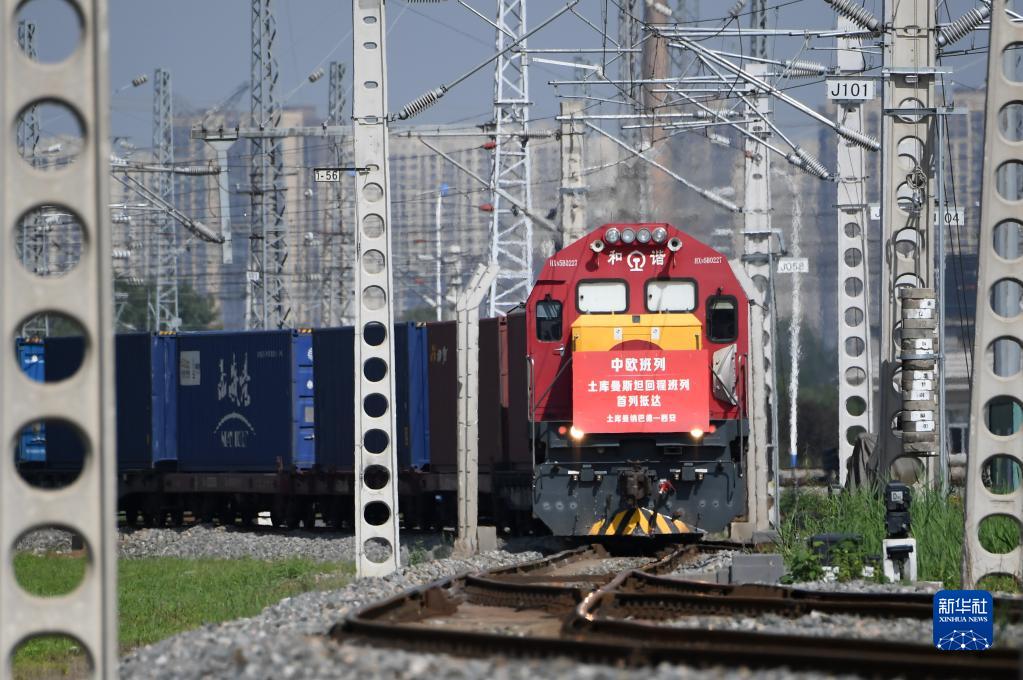 滿載土庫曼斯坦甘草中藥材原料的中歐班列回程列車抵達西安國際港站(2022年8月31日攝)。新華社記者 李一博 攝