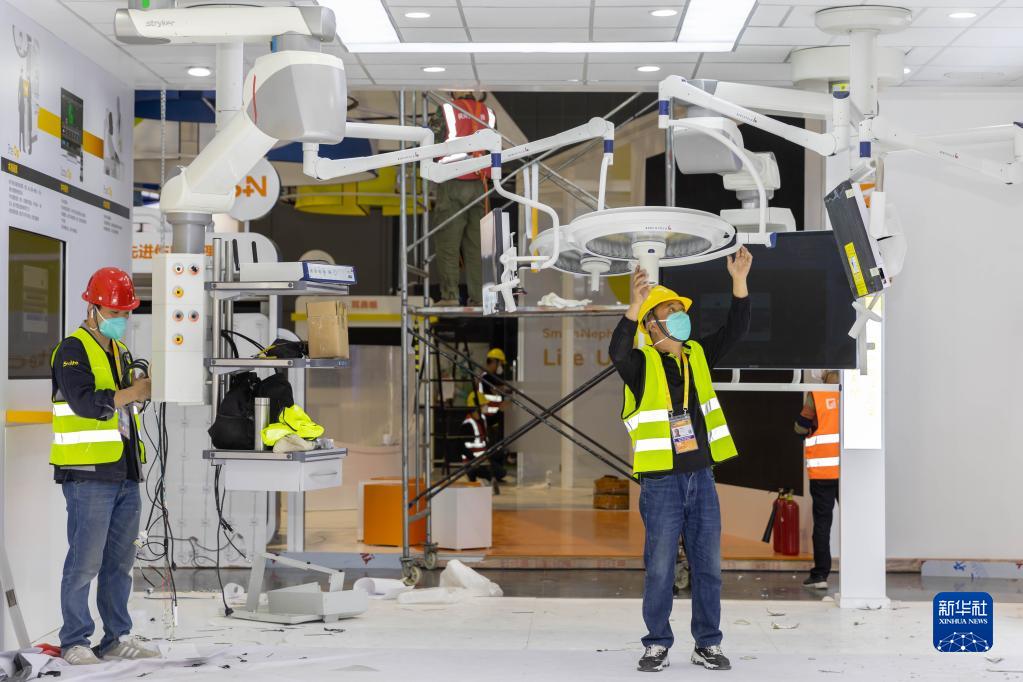 10月31日,工作人員在國家會展中心(上海)內安裝第五屆中國國際進口博覽會展位上的設備。新華社記者 王翔 攝