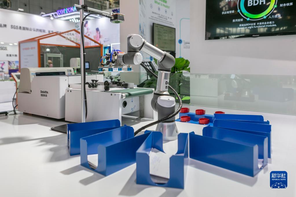 德勤公司在第三屆進博會服貿展區全球首發能完成發票分揀與蓋章工作的財務機器人手臂(2020年11月5日攝)。新華社記者 王翔 攝